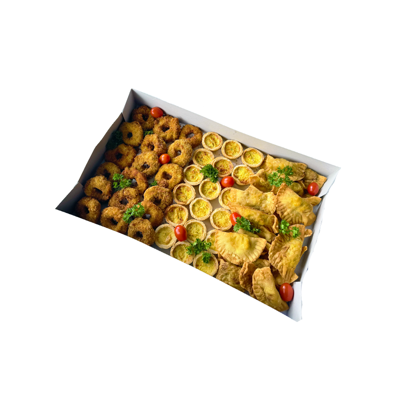Contenu : environ 60 pièces: 18 chicken donuts, 18 quiches, 25 fatayas.